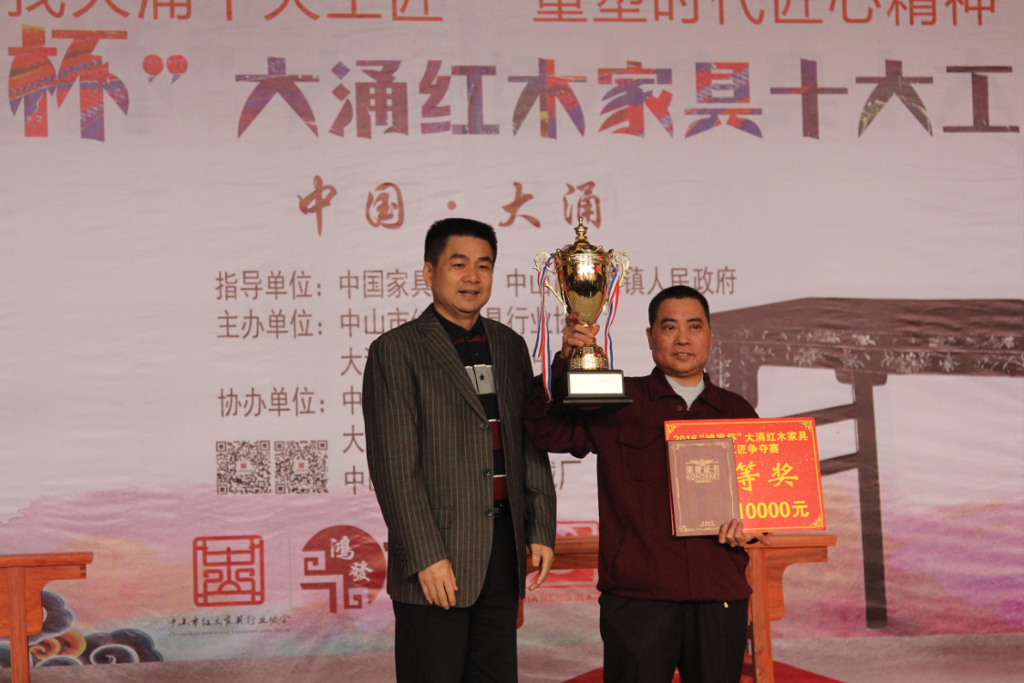 在這場面向大涌整個紅木產(chǎn)業(yè)基地的大賽中,中國紅木家具十大品牌、新中式紅木家具掌門人,紅古軒溫珍干師傅勇奪冠軍,成為大涌第一工匠,紅古軒又一次奪冠,又一次霸屏啦!厲害了,紅古軒!現(xiàn)場,中山市大涌鎮(zhèn)鎮(zhèn)長賀修虎為溫師傅頒獎。