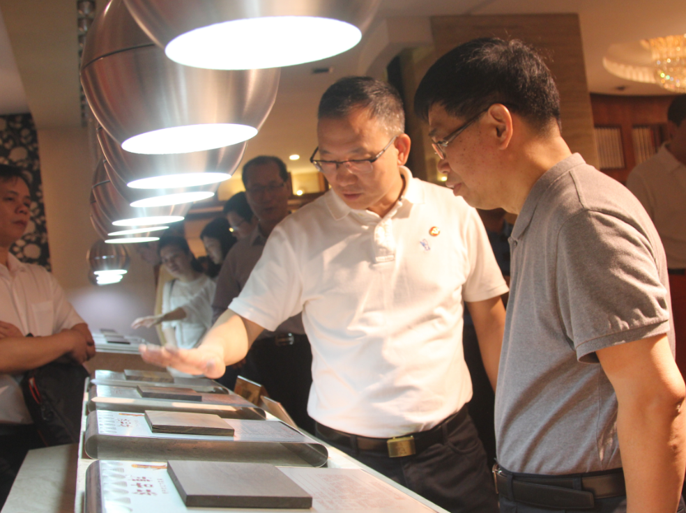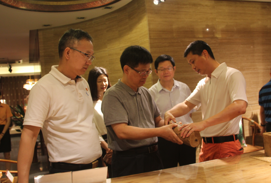 考察中,郭書記特以海南黃花梨及緬甸花梨書臺面板為例,為唐主席介紹大涌紅木家具的工藝水準(zhǔn)。