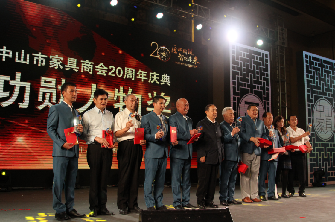 現(xiàn)場(chǎng),“中山市家具商會(huì)二十周年功勛人物”頒獎(jiǎng)典禮,更是引燃了全場(chǎng)的激情。頒獎(jiǎng)銀屏前,霓虹閃耀,星光璀璨,10位中山家具行業(yè)的“功勛人物”: